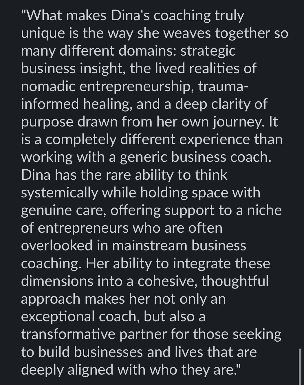Many of the opportunities I created this year to grow my business were things I would have never considered or dared to do prior to my work with Dina. She boldly but gently leads you out of your comfort zone so that you can manifest your vision for a thriving community and an artful life.”